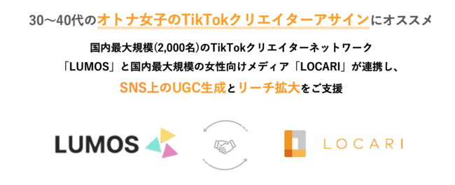 国内最大規模のTikTok MCN「LUMOS」を運営する株式会社WAND(本社: 東京都中央区)と国内最大規模の女性向けメディア「LOCARI」を運営する株式会社Wondershake(本社:東京都目黒区)は、この度30-40代のオトナ女子に特化した、TikTokクリエイターのアサイン・PR投稿・ギフティング・記事LP作成・AD配信を一気通貫で行う新プランを共同で立ち上げました。