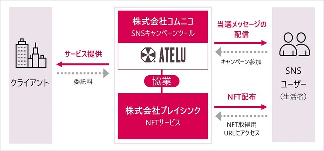 株式会社ラバブルマーケティンググループ(本社:東京都港区、代表取締役社長:林 雅之)の子会社で、企業のSNSマーケティングを支援する株式会社コムニコ(本社:東京都港区、代表取締役:長谷川 直紀、以下「コムニコ」)は、NFT技術を活用したサービスの社会実装を進める株式会社プレイシンク(本社:東京都豊島区、代表取締役:小林 陽介 以下「プレイシンク」)と協業し、コムニコの提供するSNSキャンペーンツール「ATELU(アテル)」において、プレイシンクのNFT技術を使い、NFT(非代替性トークン)をデジタルインセンティブとし、 TwitterなどSNS上のプレゼントキャンペーンで配布することが可能になりました。プレイシンクが、イベントなどでのNFTの配布において国内最大規模の実績を持つ企業であることから、今回の協業に至りました。
