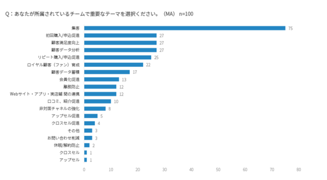 現在重要と考えているマーケティング上のテーマを尋ねたところ、「集客」が最多でした。