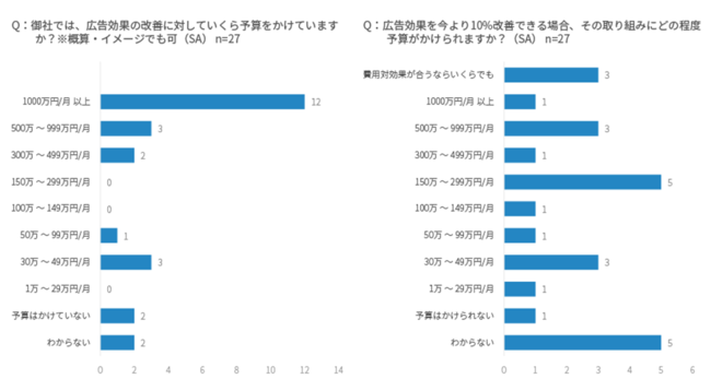 「広告効果を今より10%改善できる場合、その取り組みにどの程度予算がかけられますか?」については、回答にばらつきがあり、すでに大きく予算投下をしており、あまり追加投資する考えは見られない結果でした。