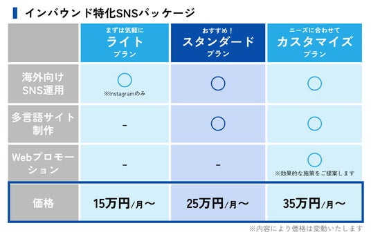 ■提供を開始する「インバウンド特化SNS」パッケージについてNAVICUSは、海外向けプロモーションに課題を抱えている企業や自治体をサポートするために、3つのプランの提供を開始します。
