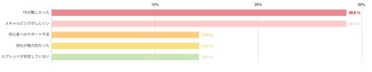 また、「FX初心者へのサポートが不足していた」「他社の魅力的なサービスに切り替えた」「スプレッドが安定していない」という意見もそれぞれ14.3%ずつ集まった。