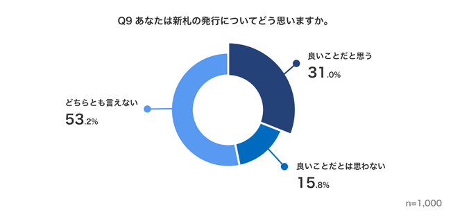 新札の発行についてどう思うか聞いたところ、「良いことだと思う」は31.0%で、「良いことだとは思わない」(15.8%)をほぼ倍のポイントで上回るものの、「どちらとも言えない」が53.2%と過半数を占める結果でした。