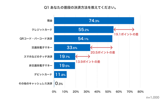 普段の決済方法を聞いたところ、「現金」(74.3%)が最も高く、ほぼ20ポイントの差で「クレジットカード」(55.2%)、「QRコード・バーコード決済」(54.1%)が続きました。