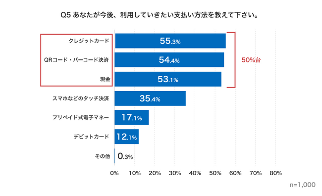 【利用していきたい支払い方法】クレジットカード、QR・バーコード決済、現金が肩を並べる