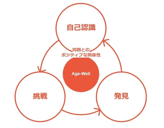 「Age-Well(エイジウェル)」とは、 挑戦と発見を通じてポジティブに歳を重ねること。名詞ではなく動詞。つまり「より良く歳を重ねる行動」を指します。「より良く歳を重ねる」ために必要な要素は「周囲とのポジティブな関係性」という基盤と3つのドライバー 1.ポジティブ な自己認識2.ポジティブな挑戦 3.ポジティブな発見、だとAge-Well Design Labは定義しております。