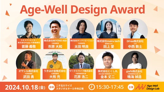 「Age-Well Design Lab」は、2024年10月18日(金)に「Age-Well Conference 」を開催いたします。超高齢社会におけるシニア業界のトップランナー総勢100名が集結する、業界最大規模のカンファレンスイベントです。カンファレンス終盤の「Age-Well Design Award」は「ポジティブに歳を重ねる生き方 - Age-Well」を創り出す団体・企業・個人を紹介し推奨する仕組みです。当日は、「Age-Well Design大賞」「オーディエンス賞」「AgeWellJapan賞」などをはじめとする計10の賞が贈られます。ぜひご参加ください。