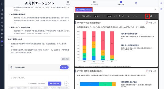 さらに、分析内容を基にワンクリックで資料を作成し、PDFまたはPPTX形式でダウンロードすることも可能です。