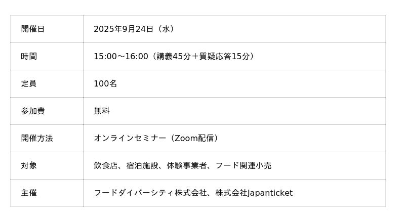 インバウンド集客向けeチケット管理システム「Japan ticket」を運営する株式会社Japanticket(本社:東京都渋谷区、代表取締役:田中宏彰、以下、Japanticket)は、2025年9月24日(水)、飲食店や宿泊事業者向けに、ハラール、ヴィーガン、ベジタリアンといったフードダイバーシティ(食の多様性)への対応をテーマとしたオンラインセミナーを開催いたします。