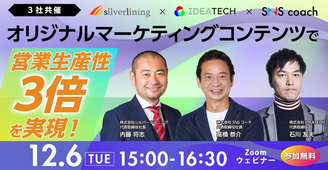 2022年12月6日に開催された株式会社IDEATECH(本社:東京都港区、代表取締役:石川友夫)が共催した『オリジナルマーケティングコンテンツで営業生産性3倍を実現!』と題するオンラインセミナーは、生産性3倍を目指せる「新時代の営業」について熱くディスカッションが繰り広げられ、ご視聴いただいた皆様のビジネスに継続的なリード獲得・集客活動を実現する気づきを与えられた、有意義なイベントとなりました。