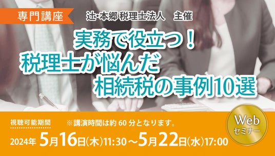 辻・本郷 税理士法人(本社:東京都新宿区、理事長:徳田孝司)は、2024年5月16日(木)より「【専門講座】実務で役立つ!税理士が悩んだ相続税の事例10選」セミナーを開催いたします。本セミナーでは実際に税理士から質問があった数多くの質問の中から、数次相続や土地評価等、汎用性の高い相続税の事例を10項目紹介し、今後の実務に役立つ判断ポイントを解説します。