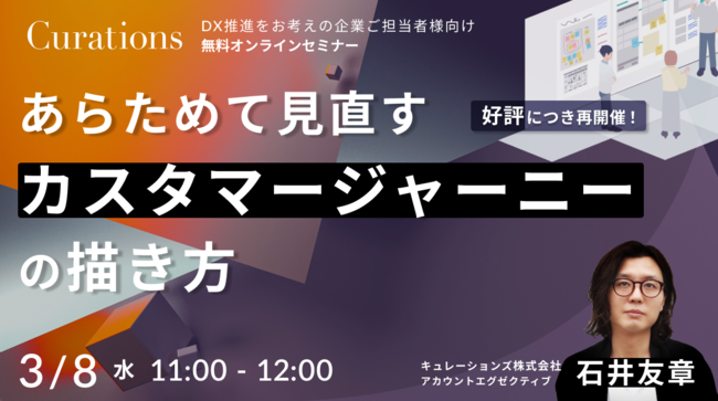 顧客企業のビジネス変革を成功に導くキュレーションズ株式会社(本社:東京都渋谷区、代表取締役社長:根本隆之、以下当社)は、『あらためて見直す「カスタマージャーニーの描き方」』を2023年3月8日(水)に開催いたします。