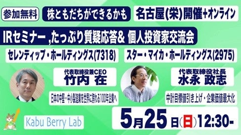 セレンディップ・ホールディングス株式会社(本社:名古屋市中区、代表取締役社長兼 CEO:竹内 在 以下、当社)は、2025 年 5 月 25 日(日)に名古屋+オンラインにて開催される「Kabu Berry」主催の個人投資家向け IR 説明会に参加しますので、下記の通りお知らせいたします。