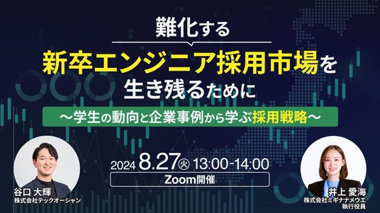 株式会社ミギナナメウエ(本社:東京都渋谷区、代表取締役CEO:古鍜冶 賢)と、 株式会社テックオーシャン(本社:東京都新宿区、代表取締役:長井 裕樹)は、2024年8月27日(火)に「【難化する新卒エンジニア採用市場で生き残る】理系学生の最新動向と企業事例から学ぶ採用戦略」の共催ウェビナーを開催いたします。