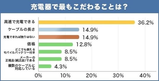 充電器は、高速で充電できることをこだわる人が36.2%でした。14.9%の人がケーブルの長さにこだわったり、充電できれば良いと回答していることから、高速充電以外の項目には突出してこだわるポイントは見受けらなかったです。