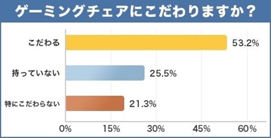 ゲーミングチェアにこだわると回答した人は、53.2%の結果となりました。半数近くがゲーミングチェアをこだわらない、もしくは所持していないと回答しています。
