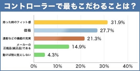 コントローラーをこだわるポイントで最も多いのはフィット感の31.9%でした。次点で価格が27.7%となっており、機能面やメーカーの正規品である点には、あまりこだわらないそうです。