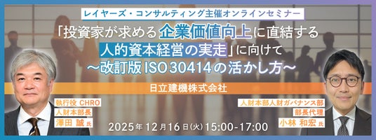 株式会社レイヤーズ・コンサルティング(東京都品川区、代表取締役CEO:杉野 尚志、以下:レイヤーズ)は、オンラインセミナー『「投資家が求める企業価値向上に直結する人的資本経営の実走」に向けて ~改訂版ISO 30414の活かし方~』を2025年12月16日(火)に開催することを発表いたします。