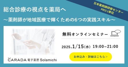 株式会社ソラミチシステム(東京都新宿区、代表取締役:田浦 貴大)は、藤田医科大学 総合診療プログラムの責任者を務める、藤田医科大学総合診療科講座 准教授 大杉 泰弘氏を講師、マイライフ株式会社 代表取締役の糸賀 誠氏、和歌山県立医科大学薬学部 社会・薬局薬学研究室教授 岡田 浩氏の両名をパネリストに迎え、PECS1単位の無料オンラインセミナー「総合診療の視点を薬局へ ~薬剤師が地域医療で輝くための6つの実践スキル~」を2025年1月15日(水)19時より開催します。