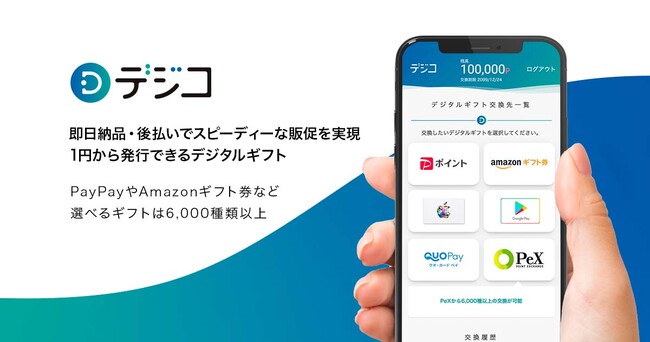 https://digi-co.net/ )は、初期費用・月額費用無料で、PayPayポイントやAmazonギフト券、Apple Gift Card、Google Play ギフトコード、QUOカードPay、PeXポイントギフトなどに交換可能なデジタルギフトを、1円単位1枚から当日発行することができるサービスです。いつでもすぐに必要な分だけ発行することができるため、企業の広告予算の調整や急なキャンペーンの実施などにも柔軟に対応することができ、当日まで人数把握が難しいイベントの謝礼などにも幅広く活用することが可能です。
