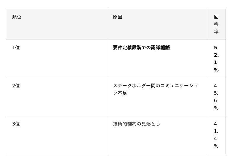 約50%のプロジェクトで何らかの手戻りが発生しており、最大の原因は「要件定義段階での認識齟齬」(52.1%)であることが明らかになりました。