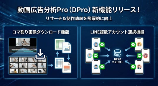 株式会社KASHIKA(本社:東京都大田区、代表取締役:小澤健太)は、提供する動画広告分析ツール「動画広告分析Pro(以下、DPro)」において、動画のリサーチおよび制作効率をさらに高める2つの新機能(「コマ割り画像ダウンロード機能」「LINE複数アカウント連携機能」)をリリースしたことをお知らせいたします。