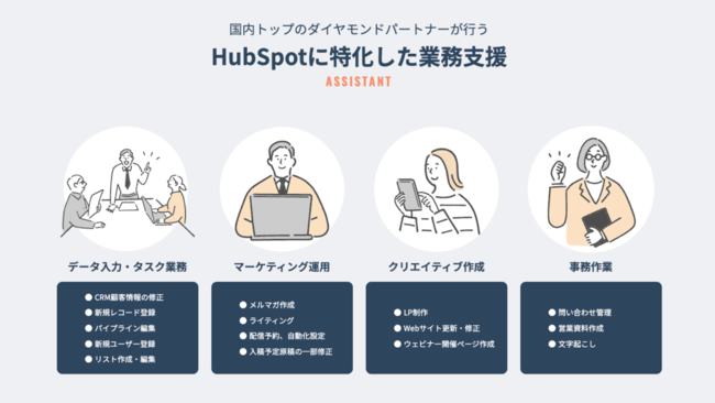 100アシスタントは、HubSpotを活用した運用業務に精通したプロ人材をアサインし、企業様ごとに必要な運用業務をオンラインでサポートするBPO(ビジネス・プロセス・アウトソーシング)サービスです。