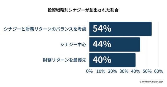 「投資戦略」と「投資先と本体/母体企業との間でのシナジー創出有無」のクロス集計を行った結果、以下の3つの投資戦略のうち、シナジーと財務的リターンのバランスを考慮している投資戦略がシナジー創出に最も効果的であることが分かりました。