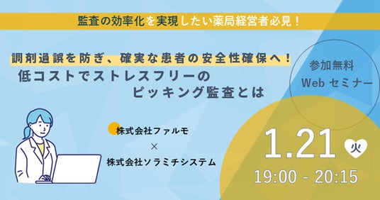 クラウド電子薬歴『CARADA 電子薬歴 Solamichi』の企画・開発・販売を行う株式会社ソラミチシステムは、株式会社ファルモの岸野 友紀氏を講師に迎え、無料オンラインセミナー「調剤過誤を防ぎ、確実な患者の安全性確保へ!低コストでストレスフリーのピッキング監査とは」を2025年1月21日(火)19時より開催します。