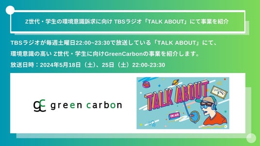Green Carbon株式会社(代表取締役:大北潤、以下Green Carbon(読み:グリーンカーボン))はこの度、TBSラジオが毎週土曜日22:00~23:30で放送している「TALK ABOUT」にて、環境意識の高い Z世代・学生に向けGreenCarbonの事業を紹介します。放送日時は、2024年5月18日(土)、25日(土)22:00-23:30(2週に渡り放送を予定しています)。
