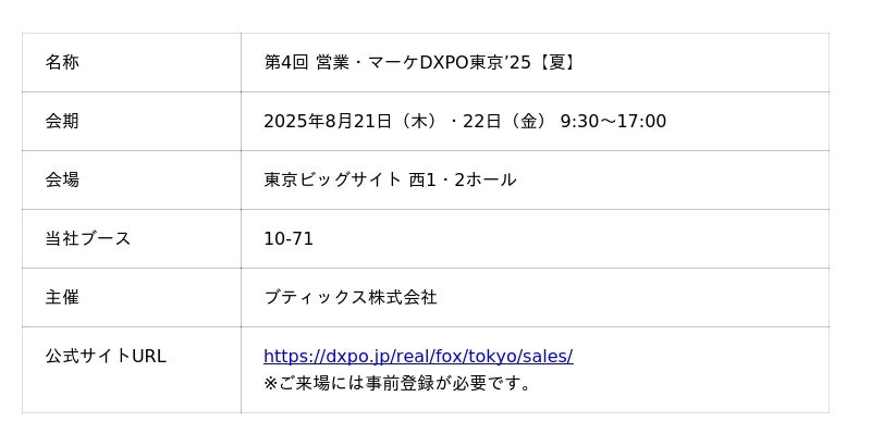 「第4回 営業・マーケDXPO東京’25【夏】」を構成する6つの専門展のうち、当社は「営業支援システム展」に出展します。
