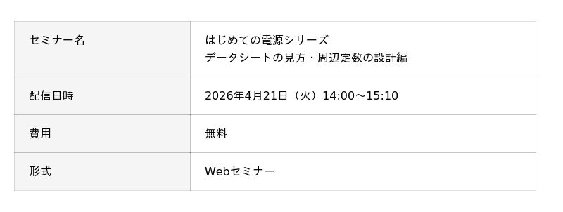 電源ICのデータシートを見て「このパラメータの意味は?」「このグラフから何が分かる?」「周辺定数の決め方は?」など、にらめっこをした経験はございませんか?本セミナーでは電源ICデータシートの見方・周辺定数の設計について学べます。