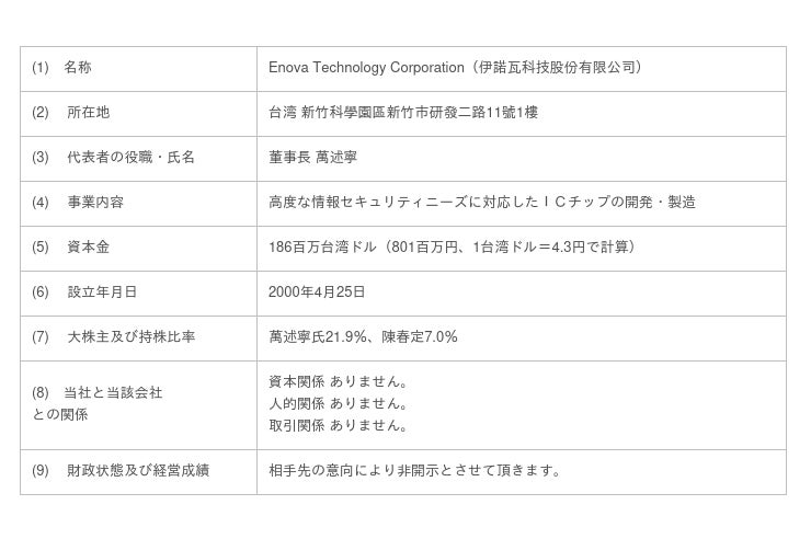 マーチャント・バンカーズ株式会社は、2023年3月27日、台湾で、政府や軍事、航空宇宙、金融など、高度な情報セキュリティニーズを持つ顧客をターゲットに、セキュリティチップを開発、製造するEnova Technology Corporation(伊諾瓦科技股份有限公司、以下、Enova Technology社といいます。)に資本参加することを決定いたしましたので、お知らせいたします。