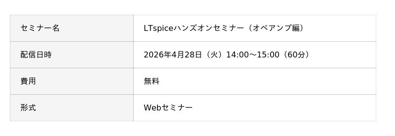 エレクトロニクス商社の丸文株式会社(代表取締役社長 兼 CEO︓堀越裕史、本社: 東京都中央区、以下、丸文)は、4月28日(火)にLTspiceを活用してオペアンプの安定性やノイズ特性の確認方法が学べる無料のオンラインセミナーを開催します。
