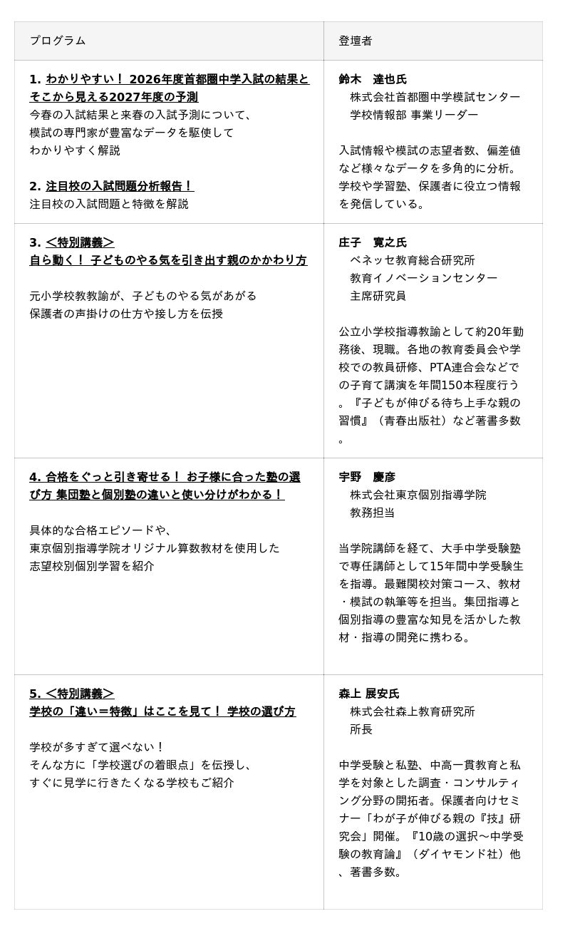 2026年度首都圏 中学入試の結果と2027年度の予測」、「注目校の入試問題分析報告」、「子どものやる気を引き出す親のかかわり方」、「学校選びの着眼点」といった内容を中学受験の専門家がくわしく解説します。