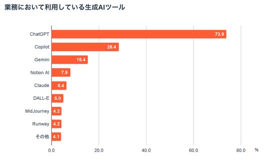 業務において生成AIを利用していると答えた人518名に具体的に使用しているツールを複数回答で聞いたところ、一番多かったのが「ChatGPT」で全体の73.9%、2番目が「Copilot」(28.4%)、3番目が「Gemini」(15.4%)でした。ChatGPTについては利用者のうち34.4%が有料版を使っていると答えました。また利用ツールについてBtoB企業のマーケターとBtoC企業のマーケターの間に傾向の大きな差はありませんでした。
