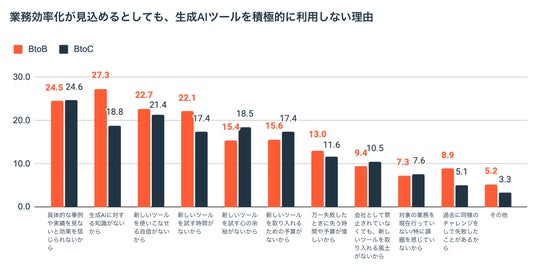 しかしながら、業務効率化できる生成AIのツールがあり会社からも利用を禁止されていないとしても、「興味はあるが、難しそう」または「利用したいとは思わない」と答えた人にその理由を複数回答で尋ねたところ、1位は「具体的な事例や実績を見ないと効果を信じられないから」(24.5%)、2位は「生成AIに対する知識がないから」(23.8%)、3位は「新しいツールを使いこなせる自信がないから」(22.1%)でした。生成AIの活用で成果が出ることを期待する人が多い一方で、実際に自分自身が使うとなった際には「新しいものに対する懸念」や「自信のなさ」がハードルになっていると考えられます。