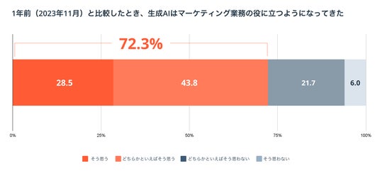 「1年前(2023年11月)と比較したとき、生成AIはマーケティング業務の役に立つようになってきた」という主張に対する考えを聞いたところ、「そう思う」および「どちらかといえばそう思う」と答えた人の合計は全体の72.3%となり、業務支援ツールとしての生成AIの評価はこの1年で高まっていることが分かりました。