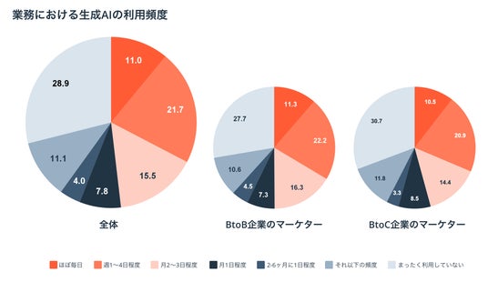 生成AIを少なくとも週1回以上業務において利用していると答えた人は全体の32.7%となりました。一方で業務において生成AIをまったく利用していないと答えた人は全体の28.9%と約3割に留まりました(*)。週1回以上利用している人およびまったく利用していない人ともに、BtoB企業のマーケターとBtoC企業のマーケターの傾向に大きな差は見られませんでした。