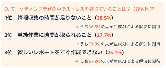 「マーケティング業務の中でストレスを感じていること」を複数回答の選択式で聞いたところ、1位が「情報収集の時間が足りないこと」(28.5%)、2位が「単純作業に時間が取られること」(27.7%)、3位が「欲しいレポートをすぐ作成できないこと(数字に加工が必要など)」(25.1%)という結果になりました。同時にこれらの3領域について「生成AIを使えば解決できるかもしれない」と答えた人はそれぞれ66.8%、71.3%、67.8%となり、生成AIへの期待が高いこともわかりました。