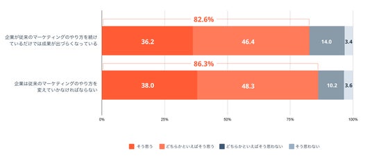 マーケターに「企業が従来のマーケティングのやり方を続けているだけでは成果が出づらくなっている」という主張に対する自身の考えを聞いたところ、「そう思う」および「どちらかといえばそう思う」と答えた人の合計が82.6%と、肯定派が多数となりました。同様に「企業は従来のマーケティングのやり方を変えていかなければならない」という主張を肯定した人は86.3%となりました。
