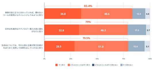 「業務の役に立つと分かっていれば、慣れないツールの使用にもチャレンジしてみようと思う」という主張に対する考えを聞いたところ、「そう思う」および「どちらかといえばそう思う」と答えた人の合計は全体の83.4%にのぼりました。また「日本は先進的なテクノロジー導入の波に遅れがちだと思う」と考えている人が全体の79%となった一方で「生成AIについては、今から国と企業が努力を続ければうまく活用して成果を出していけると思う」と考えている人が全体の79.5%となり、生成AIの業務への活用に肯定的な傾向が見られました。