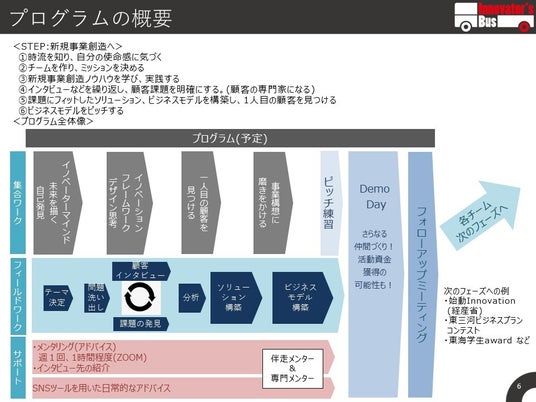参加者は、集合ワークやフィールドワークを通じて新規事業創造ノウハウを学びます。CLUEはインベーダーマインドの醸成や、イノベーション創造手法「デザイン思考」、フレームワーク「リーンキャンバス(ビジネスモデル構築するためのフレームワーク)」、「ユーザーインタビュー」などを、実践を通して学ぶ機会を提供します。CLUEのもつイノベーション創出へのネットワークを活用し、各種専門家やメンターのサポートを受けながら、チームで新規事業プランの構築に取り組んでいただきます。