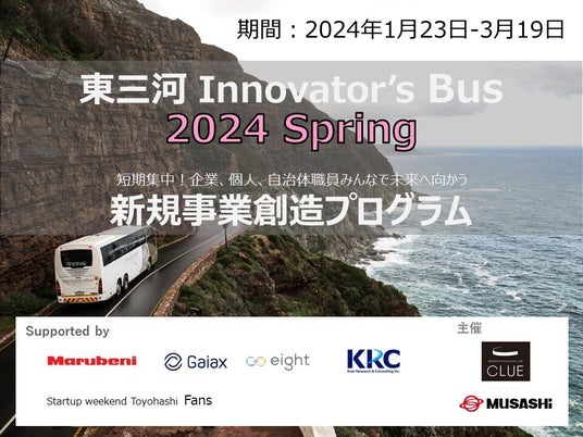 武蔵精密工業株式会社(本社:愛知県豊橋市、代表取締役社長:大塚浩史、以下ムサシ)が運営するMUSASHi Innovation Lab CLUE(住所:愛知県豊橋市駅前大通一丁目135番地 ココラアベニュー3F、2018年12月設立)は、2024年1月23日(火)より開始する約1.5カ月間のインキュベーションプログラム「東三河Innovator’s Bus 2024 Spring(以下、本プログラム)」の参加申し込みを開始しました。本プログラムでは、デザイン思考の実践とビジネスモデルの構築を目指すことでイノベーション創出に向けてのマインドセットとスキルセットをもった人材育成を行います。