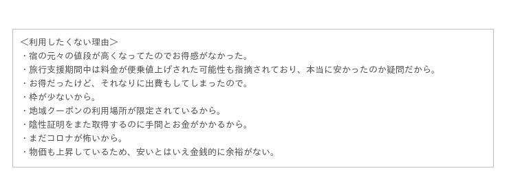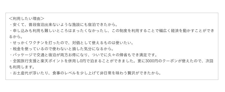 旅行そのものがお得になったとしても、その分他で散財してしまったり、陰性証明をとるのに手間がかかったりして、もう一度利用しようという気にならないならないようです。