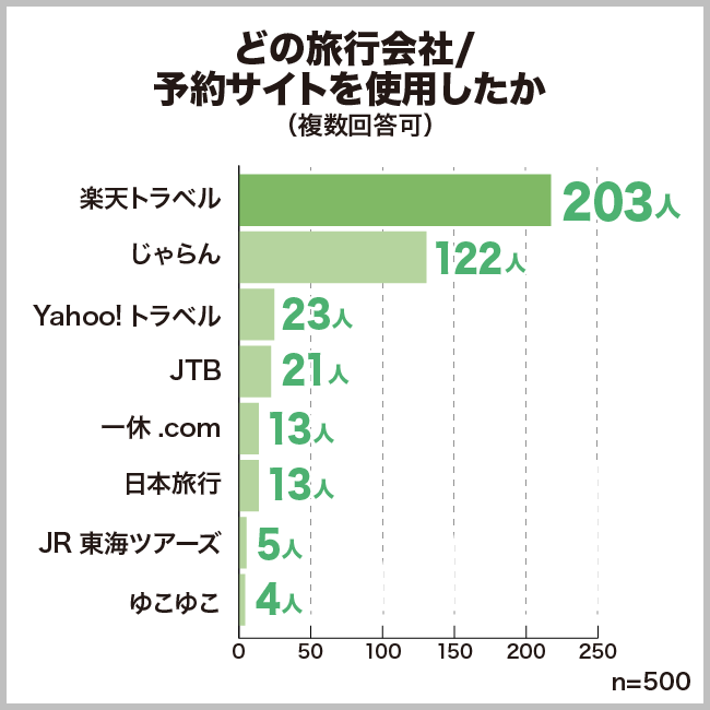 利用されていた旅行会社は「楽天トラベル」が1位でしたが、楽天系列のサービスを利用する人にとってはポイントを有効利用できるという点も大きな魅力となっているようです。