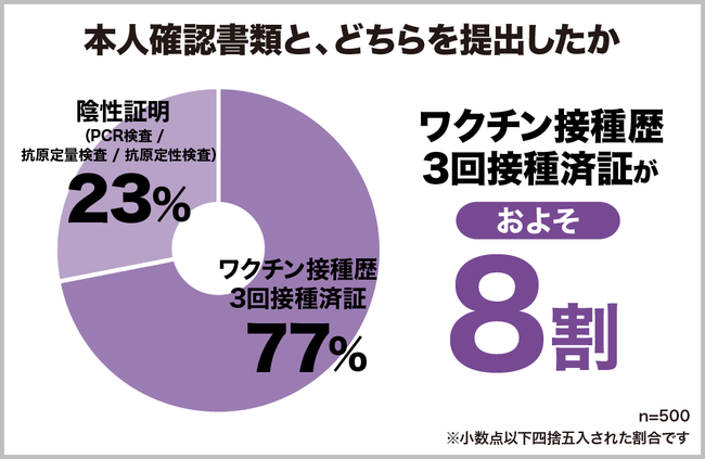 どちらを提出したか聞いたところ、8割近くの人がワクチンパスポートを提出したと答えています。