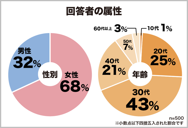 今回、全国旅行支援を利用した人500人に、行き先や利用方法などについてアンケートを取りました。男女の割合、年代は以下の通りです。