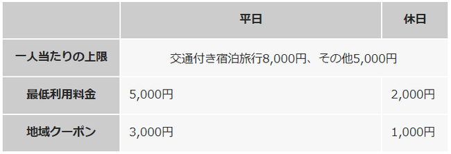 全国の旅行が対象となっており、7連泊まで可能です。旅先で利用できる地域クーポンももらえますので、土産店などでのお買い物もお得になっています。