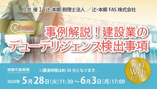 辻・本郷 税理士法人(本社:東京都新宿区、理事長:徳田孝司)は、辻・本郷 FAS株式会社(本社:東京都千代田区、代表取締役:山田翔吾)と共催で2023年12月に開催した「事例解説! 建設業のデューデリジェンス検出事項」セミナーを、今回特別にアーカイブ配信いたします。デューデリジェンス(以下「DD」)は、M&Aで対象会社が買収にふさわしい企業かどうかを検証し、最終的な意思決定に資する手続きです。本セミナーは、辻・本郷グループで実際にあった事例を基に、建設業でよくあるDDの検出事項を解説します。加えて、正確な企業価値と買収リスクを把握する方法もご説明いたします。